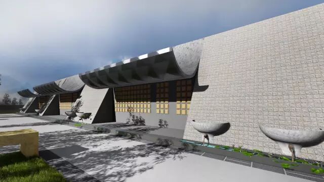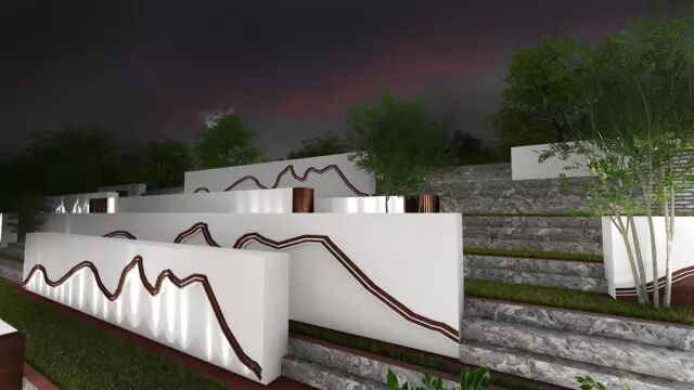 本案以金属结构形成上翘棚顶结构,其下以壁葬形式放置产品。左右以传统护坡形式硬化,石质与钢质,直线与曲线形成鲜明对比,其下方点缀小型水景,以钢制渠道收边,形成小型的动态水。动静之间形成朦胧的禅意景观。