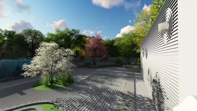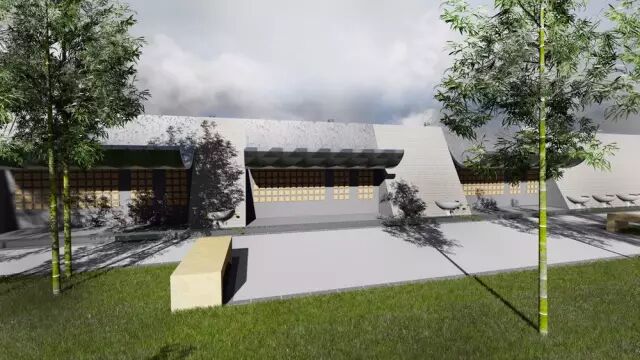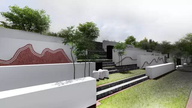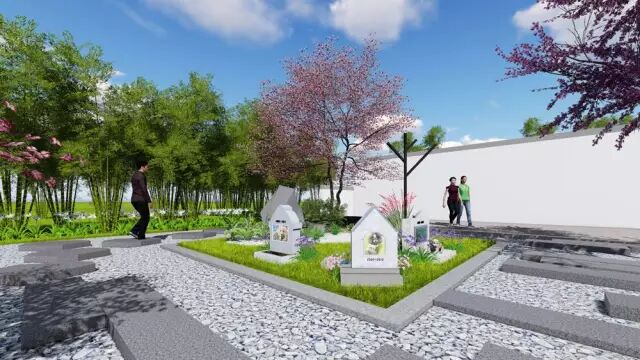 本设计打破以往枯山水的做法,把枯山水运用到墙上。枯山水景墙充满禅意,给人空灵、安静、祥和之感。石头设计成镂空的,里面用于摆放骨灰罐,每一个石头里面就是一个葬式,这种创新的形式打破了以往墓区千篇一律的格子墙壁葬,既有壁葬的功能,又是一道具有东方美学的景观,真正的做到了怡景,怡观,怡葬。