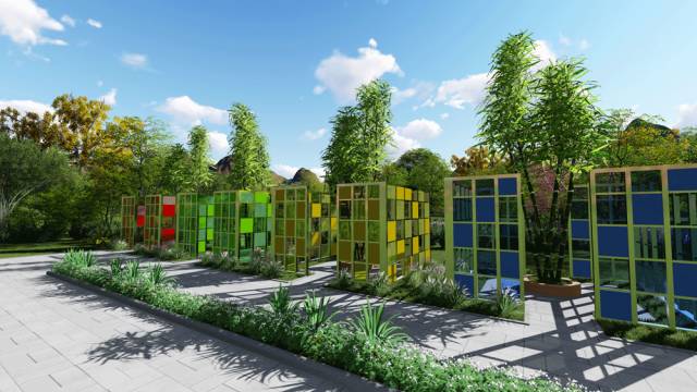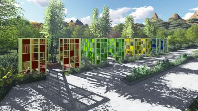 本设计提取国外的基督教堂的色彩元素,同时也打破中国墓区原有色彩,使用比较艺术的色彩,色彩的运用打破了以往墓区带来的凄凉,在光线的照射下色彩斑斓,宛若梦幻般的天堂,这契合了大家希望逝者去到一个美丽的天堂。自古有天圆地方的说法,外观形式采用方形,里面是圆形的花坛,同时有座椅的功能,祭拜者可以坐在这里休息、缅怀逝者。墙面的方格,交错做成盒形,用于安放骨灰盒。墙面设计成半包围状,营造了一个私密的空间。