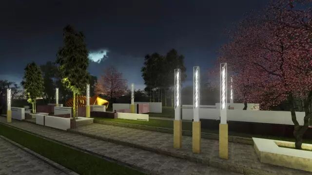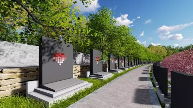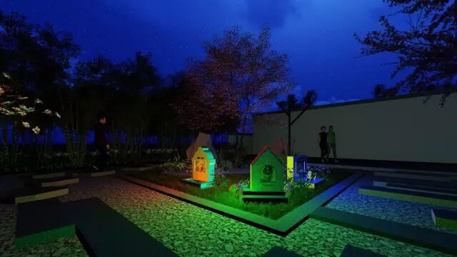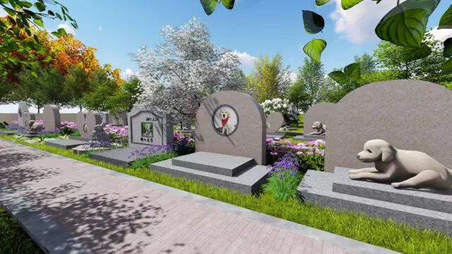 在一片石子中种植一颗黑色的“树”,墓碑中植入灯泡,嵌上方镜子刻上名字,树白天吸收能量,墓碑中的灯晚上发光,既能给逝去的爱宠提供最后的归属,又有作为景观灯的作用。