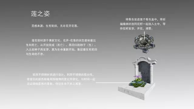 莲花取材源于佛家文化。花开-花落的状态意味着出生和死亡,从开放完成(死亡),再回归到种子(生),入土后种子再发芽,意为生命重新开始,象征着生死轮回与生命的不息。将骨灰装进莲子骨灰盒中,用祈福绳绑好连同花籽一起放入土中,等待花籽发芽,开花,凋零。采用不锈钢材质进行设计,利用不锈钢的吸光性,使莲花的颜色随着周围植物的变化而变化,与时间一起见证物换星移的景象,传达生命不息之寓意。